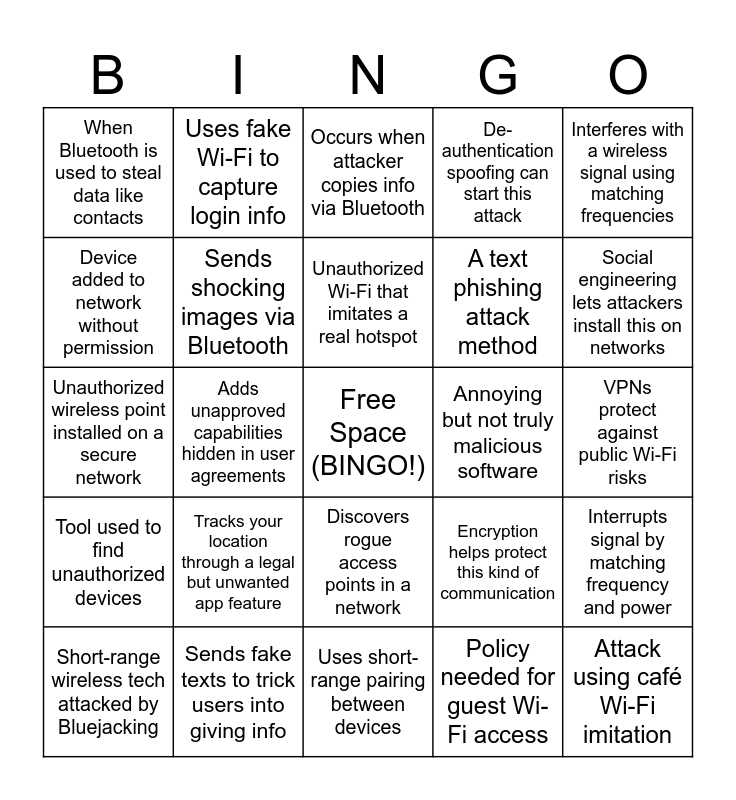 This bingo card has a free space and 24 words: Tracks your location through a legal but unwanted app feature, Sends fake texts to trick users into giving info, Unauthorized Wi-Fi that imitates a real hotspot, Short-range wireless tech attacked by Bluejacking, Interferes with a wireless signal using matching frequencies, When Bluetooth is used to steal data like contacts, Device added to network without permission, Uses fake Wi-Fi to capture login info, Annoying but not truly malicious software, Discovers rogue access points in a network, A text phishing attack method, Unauthorized wireless point installed on a secure network, Encryption helps protect this kind of communication, Interrupts signal by matching frequency and power, Sends shocking images via Bluetooth, Policy needed for guest Wi-Fi access, VPNs protect against public Wi-Fi risks, Occurs when attacker copies info via Bluetooth, Social engineering lets attackers install this on networks, Adds unapproved capabilities hidden in user agreements, Attack using café Wi-Fi imitation, Tool used to find unauthorized devices, De-authentication spoofing can start this attack and Uses short-range pairing between devices.