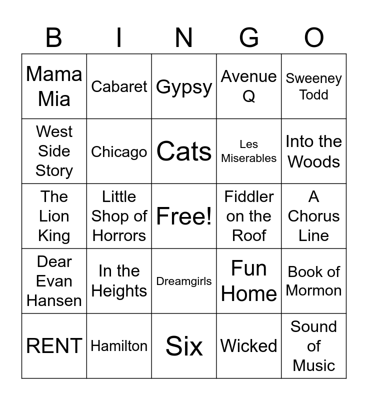 This bingo card has a free space and 24 words: In the Heights, Hamilton, Cats, RENT, Sweeney Todd, Mama Mia, West Side Story, Cabaret, Fiddler on the Roof, Dreamgirls, Les Miserables, The Lion King, Fun Home, Book of Mormon, Chicago, Wicked, A Chorus Line, Gypsy, Into the Woods, Little Shop of Horrors, Sound of Music, Dear Evan Hansen, Avenue Q and Six.