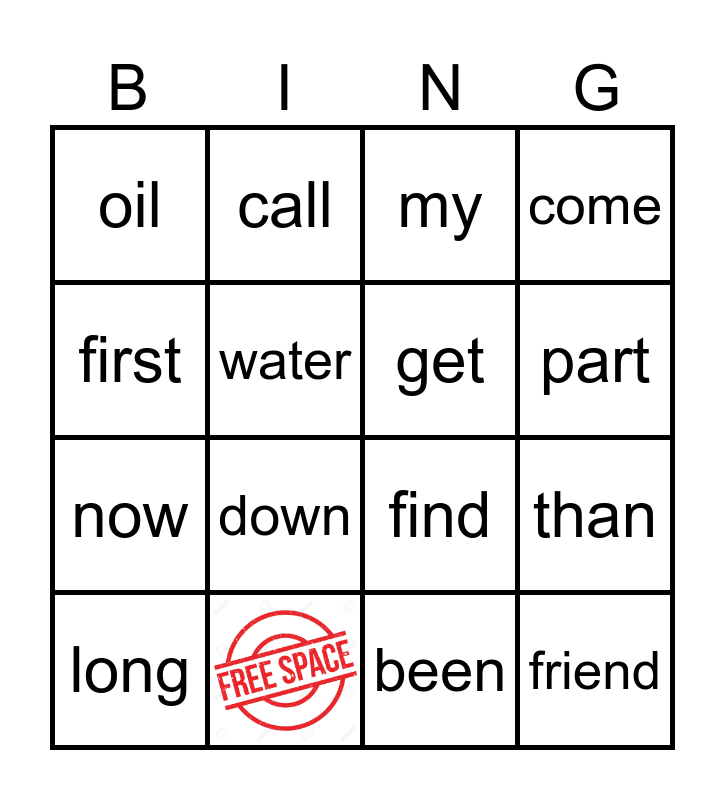This bingo card has 1 images and 15 words: than, my, oil, now, call, find, been, first, water, long, come, down, part, get and friend.