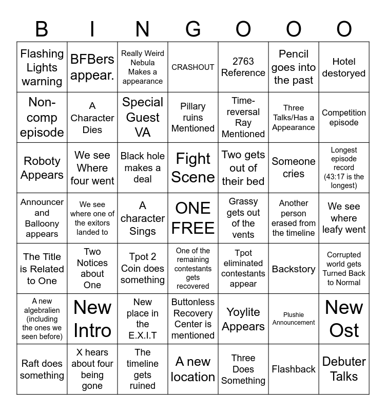 This bingo card has a free space and 48 words: Yoylite Appears, Three Talks/Has a Appearance, A new location, We see where one of the exitors landed to, Black hole makes a deal, We see where leafy went, BFBers appear., X hears about four being gone, Pencil goes into the past, One of the remaining contestants gets recovered, Hotel destoryed, CRASHOUT, Someone cries, Two gets out of their bed, A new algebralien (including the ones we seen before), Another person erased from the timeline, Non-comp episode, Competition episode, Plushie Announcement, 2763 Reference, Time-reversal Ray Mentioned, A character Sings, Flashing Lights warning, A Character Dies, New Ost, Special Guest VA, Longest episode record (43:17 is the longest), Raft does something, Fight Scene, We see Where four went, Flashback, Grassy gets out of the vents, Corrupted world gets Turned Back to Normal, New Intro, Announcer and Balloony appears, Tpot eliminated contestants appear, Backstory, Roboty Appears, Tpot 2 Coin does something, New place in the E.X.I.T, The Title is Related to One, Debuter Talks, Really Weird Nebula Makes a appearance, The timeline gets ruined, Pillary ruins Mentioned, Buttonless Recovery Center is mentioned, Two Notices about One and Three Does Something.
