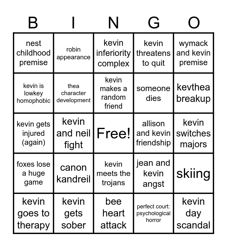 This bingo card has a free space and 24 words: canon kandreil, kevin gets sober, kevin makes a random friend, kevin goes to therapy, wymack and kevin premise, nest childhood premise, kevin is lowkey homophobic, robin appearance, allison and kevin friendship, kevin meets the trojans, someone dies, kevin gets injured (again), jean and kevin angst, skiing, thea character development, perfect court: psychological horror, kevin switches majors, kevin inferiority complex, kevthea breakup, kevin and neil fight, kevin day scandal, foxes lose a huge game, kevin threatens to quit and bee heart attack.