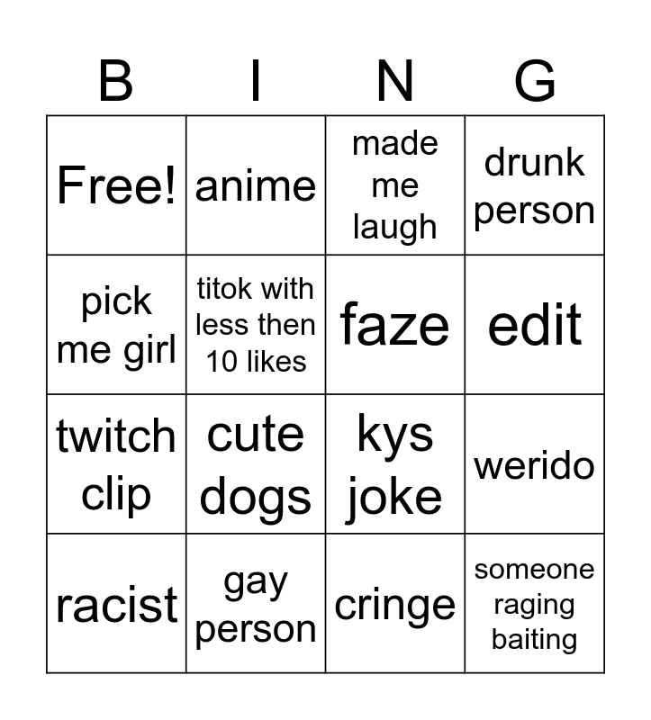 This bingo card has 16 words: racist, gay person, made me laugh, drunk person, pick me girl, anime, kys joke, werido, Free!, titok with less then 10 likes, cringe, edit, twitch clip, cute dogs, faze and someone raging baiting.