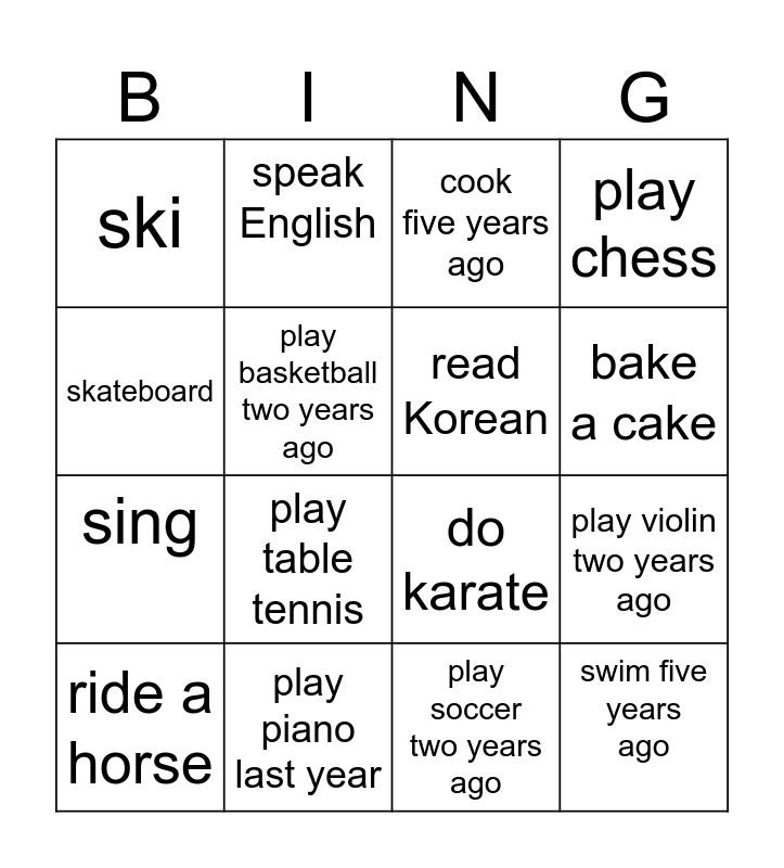 This bingo card has 27 words: play guitar, dance, sing, draw last year, play basketball two years ago, cook five years ago, speak English, swim five years ago, play piano last year, speak Chinese, do karate, play chess, ride a bike five years ago, surf, play table tennis, paint, read Korean, bake a cake, wake up early, ski, play soccer two years ago, play koto, play violin two years ago, ride a horse, eat spicy food, skateboard and ice skate two years ago.