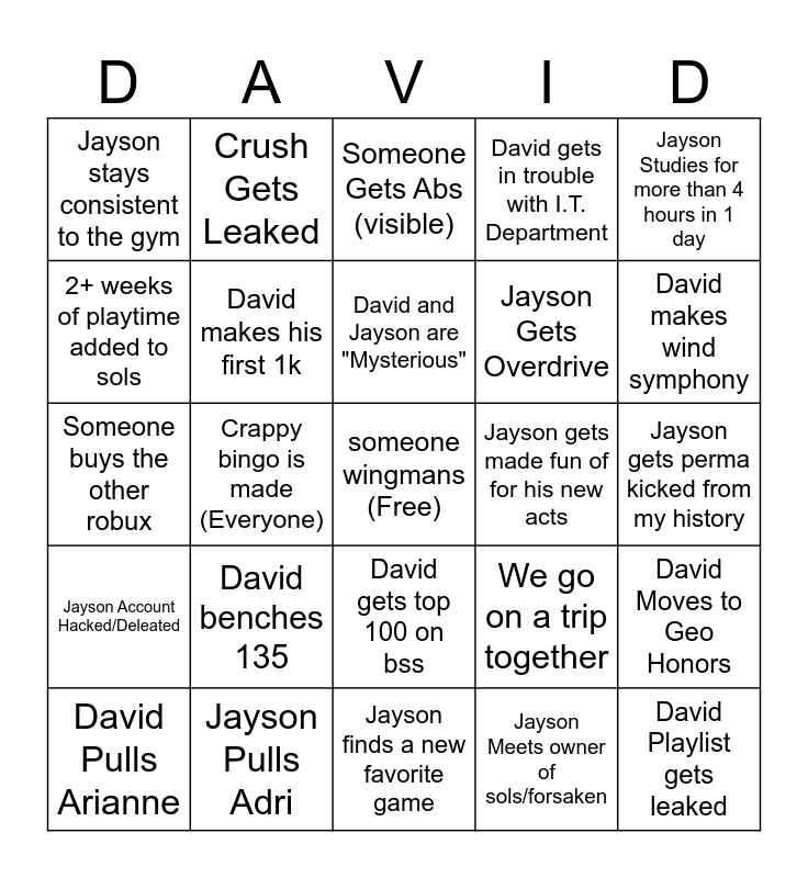 This bingo card has a free space and 24 words: David benches 135, Jayson Pulls Adri, David and Jayson are "Mysterious", David Pulls Arianne, Jayson Studies for more than 4 hours in 1 day, Jayson stays consistent to the gym, 2+ weeks of playtime added to sols, Crush Gets Leaked, Jayson gets made fun of for his new acts, David gets top 100 on bss, Jayson Gets Overdrive, Someone buys the other robux, We go on a trip together, David Moves to Geo Honors, David makes his first 1k, Jayson Meets owner of sols/forsaken, Jayson gets perma kicked from my history, Someone Gets Abs (visible), David makes wind symphony, Crappy bingo is made (Everyone), David Playlist gets leaked, Jayson Account Hacked/Deleated, David gets in trouble with I.T. Department and Jayson finds a new favorite game.