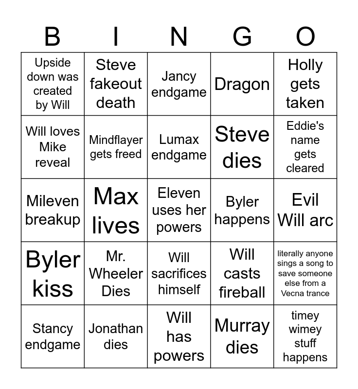 This bingo card has a free space and 24 words: Mr. Wheeler Dies, Jonathan dies, Lumax endgame, Stancy endgame, Holly gets taken, Upside down was created by Will, Will loves Mike reveal, Steve fakeout death, Byler happens, Will sacrifices himself, Steve dies, Mileven breakup, Will casts fireball, literally anyone sings a song to save someone else from a Vecna trance, Mindflayer gets freed, Murray dies, Evil Will arc, Jancy endgame, Eddie's name gets cleared, Max lives, timey wimey stuff happens, Byler kiss, Dragon and Will has powers.