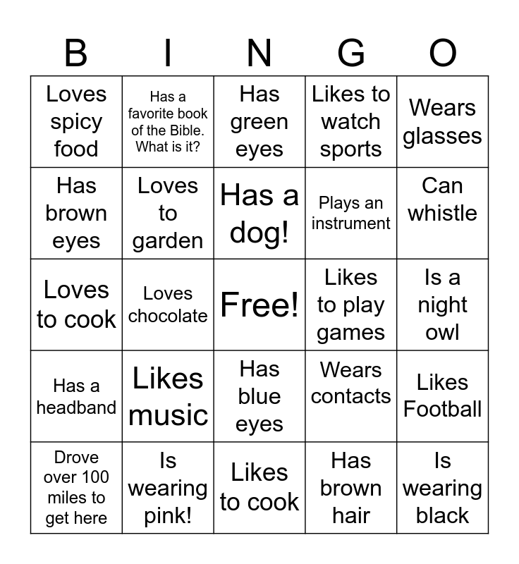 This bingo card has a free space and 24 words: Likes music, Is wearing pink!, Has a dog!, Drove over 100 miles to get here, Wears glasses, Loves spicy food, Has brown eyes, Has a favorite book of the Bible. What is it?, Likes to play games, Has blue eyes, Plays an instrument, Loves to cook, Wears contacts, Likes Football, Loves to garden, Has brown hair, Is a night owl, Has green eyes, Can whistle, Loves chocolate, Is wearing black, Has a headband, Likes to watch sports and Likes to cook.