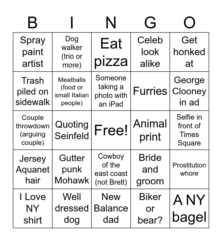 This bingo card has a free space and 24 words: Gutter punk Mohawk, Well dressed dog, Someone taking a photo with an iPad, I Love NY shirt, Get honked at, Spray paint artist, Trash piled on sidewalk, Dog walker (trio or more), Animal print, Cowboy of the east coast (not Brett), Furries, Couple throwdown (arguing couple), Bride and groom, Prostitution whore, Meatballs (food or small Italian people), Biker or bear?, Selfie in front of Times Square, Eat pizza, George Clooney in ad, Quoting Seinfeld, A NY bagel, Jersey Aquanet hair, Celeb look alike and New Balance dad.