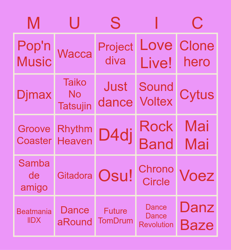 This bingo card has 28 words: Beatmania llDX, Dance Central, Just dance, Dance Dance Revolution, Clone hero, Djmax, Wacca, Osu!, Rock Band, Danz Baze, Groove Coaster, Taiko No Tatsujin, Future TomDrum, Chrono Circle, Cytus, Dancerush Stardom, Gitadora, Project diva, Love Live!, Voez, Pop'n Music, Dance aRound, D4dj, Sound Voltex, Mai Mai, Samba de amigo, Rhythm Heaven and Muse Dash.