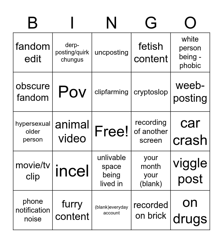 This bingo card has a free space and 44 words: true schizopost, on drugs, esoteric meme/edit/post, phone notification noise, bad screen recording, recorded on brick, uncposting, unsupervised child, white person being -phobic, furry content, fetish content, recording of another screen, unlivable space being lived in, incel, seeing the same video (or variant) 3+ times, (blank)everyday account, stolen cringe compilation content, hypersexual older person, band kid-posting (dankmemes), weeb-posting, derp-posting/quirk chungus, clearly autistic, horrible musician promoting their music, fandom edit, beginner artist, car crash, ai slop, text post, your month your (blank), movie/tv clip, white person n word, viggle post, “type yes to affirm”, chinese, animal video, streamer clip, banger indie music, “corecore” edit, clipfarming, obscure fandom, cryptoslop, alpha/sigma male, Pov and Religious content.