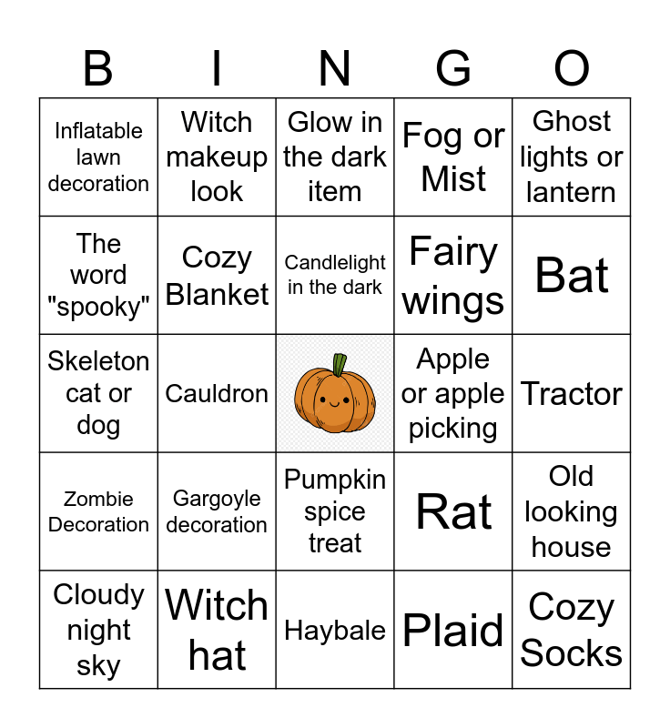 This bingo card has a free space and 30 words: Witch hat, Jack-o-lantern, Cauldron, Ghost decoration, Inflatable lawn decoration, Glow in the dark item, Cozy Blanket, Pumpkin spice treat, Apple or apple picking, Haybale, Tractor, Cozy Socks, Plaid, Fireplace, Bat, Owl, Rat, Zombie Decoration, Gargoyle decoration, Ghost lights or lantern, Skeleton cat or dog, Crown/tiara, Witch makeup look, Fairy wings, The word "spooky", Fog or Mist, Old looking house, Cloudy night sky, Candlelight in the dark and Crunchy leaves.