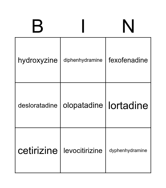 This bingo card has 9 words: cetirizine, fexofenadine, diphenhydramine, desloratadine, hydroxyzine, lortadine, olopatadine, dyphenhydramine and levocitirizine.