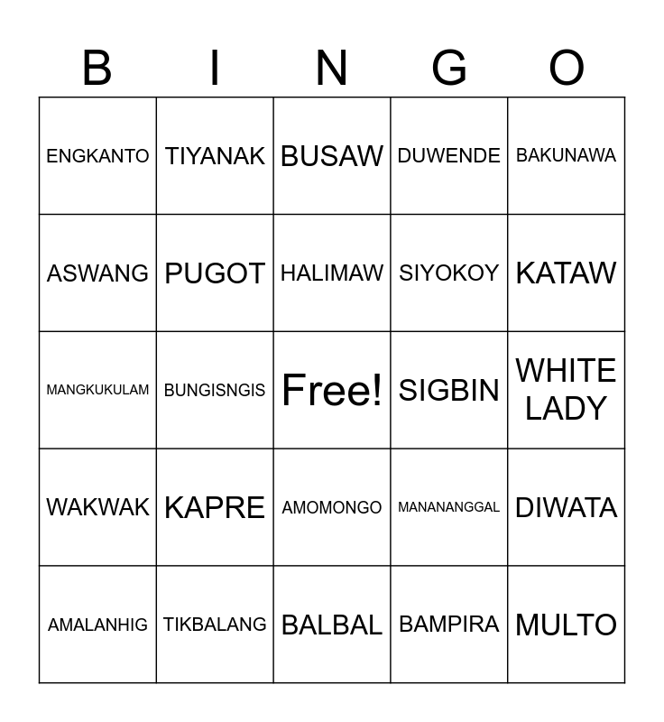 This bingo card has a free space and 24 words: KAPRE, TIKBALANG, HALIMAW, AMALANHIG, BAKUNAWA, ENGKANTO, ASWANG, TIYANAK, SIGBIN, AMOMONGO, SIYOKOY, MANGKUKULAM, MANANANGGAL, DIWATA, PUGOT, BAMPIRA, WHITE LADY, BUSAW, KATAW, BUNGISNGIS, MULTO, WAKWAK, DUWENDE and BALBAL.