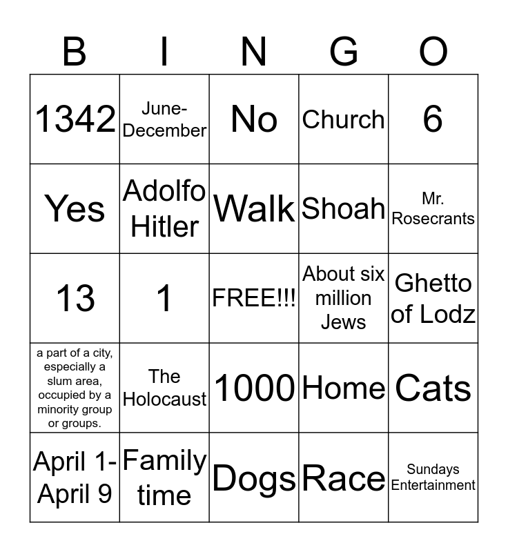 This bingo card has a free space and 24 words: The Holocaust, Family time, Walk, April 1-April 9, 6, 1342, Yes, June-December, About six million Jews, 1000, Shoah, 13, Home, Cats, Adolfo Hitler, Race, Ghetto of Lodz, No, Mr. Rosecrants, 1, Sundays Entertainment, a part of a city, especially a slum area, occupied by a minority group or groups., Church and Dogs.