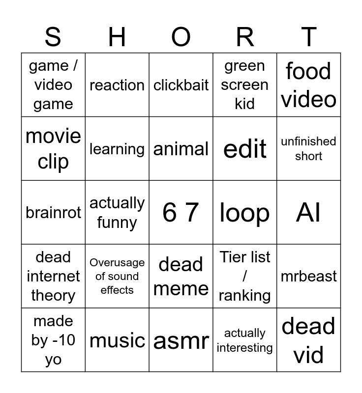 This bingo card has a free space and 24 words: Overusage of sound effects, music, animal, made by -10 yo, food video, game / video game, movie clip, reaction, loop, dead meme, edit, brainrot, Tier list / ranking, mrbeast, learning, actually interesting, AI, clickbait, unfinished short, actually funny, dead vid, dead internet theory, green screen kid and asmr.