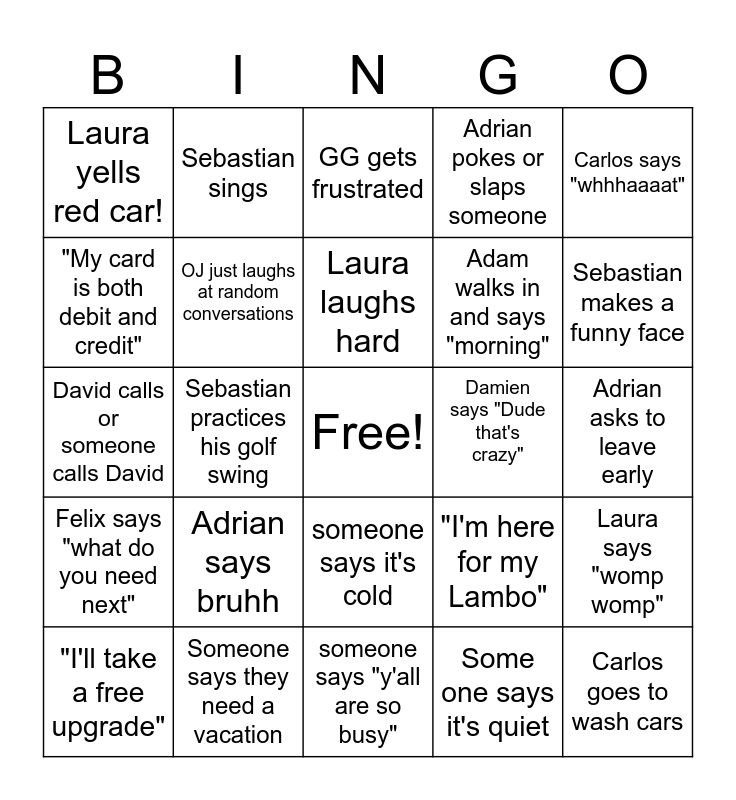 This bingo card has a free space and 24 words: Adrian says bruhh, Someone says they need a vacation, Laura laughs hard, "I'll take a free upgrade", Carlos says "whhhaaaat", Laura yells red car!, "My card is both debit and credit", Sebastian sings, Damien says "Dude that's crazy", someone says it's cold, Adam walks in and says "morning", David calls or someone calls David, "I'm here for my Lambo", Laura says "womp womp", OJ just laughs at random conversations, Some one says it's quiet, Adrian asks to leave early, GG gets frustrated, Sebastian makes a funny face, Sebastian practices his golf swing, Carlos goes to wash cars, Felix says "what do you need next", Adrian pokes or slaps someone and someone says "y'all are so busy".