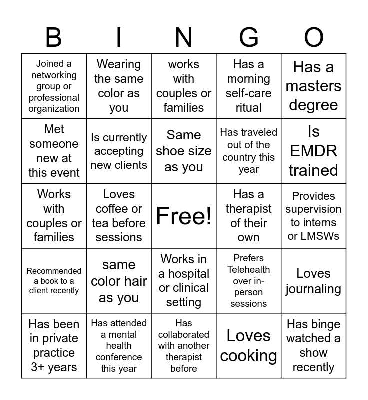 This bingo card has a free space and 24 words: Has been in private practice 3+ years, same color hair as you, Same shoe size as you, Loves cooking, Has a masters degree, Joined a networking group or professional organization, Wearing the same color as you, works with couples or families, Has a therapist of their own, Provides supervision to interns or LMSWs, Works with couples or families, Is currently accepting new clients, Prefers Telehealth over in- person sessions, Loves journaling, Met someone new at this event, Has attended a mental health conference this year, Has collaborated with another therapist before, Has a morning self-care ritual, Is EMDR trained, Recommended a book to a client recently, Loves coffee or tea before sessions, Works in a hospital or clinical setting, Has traveled out of the country this year and Has binge watched a show recently.