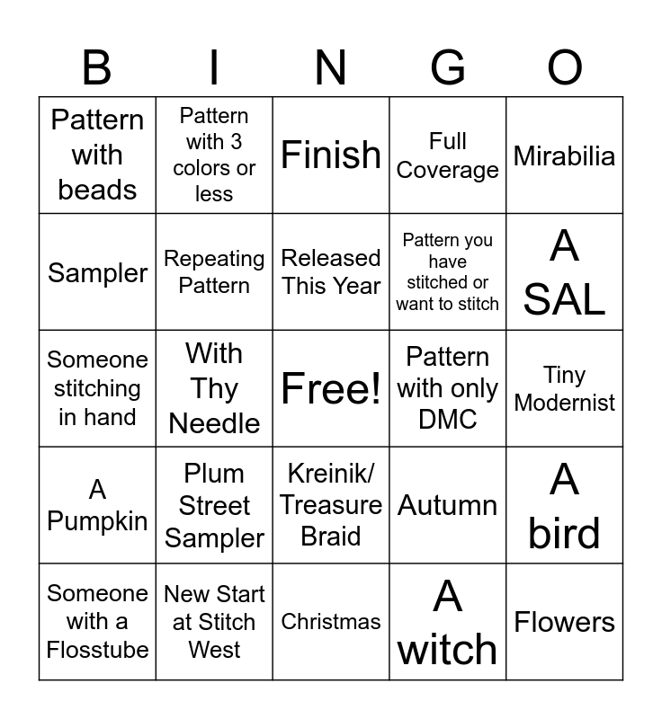 This bingo card has a free space and 24 words: Plum Street Sampler, New Start at Stitch West, Released This Year, Someone with a Flosstube, Mirabilia, Pattern with beads, Sampler, Pattern with 3 colors or less, Pattern with only DMC, Kreinik/ Treasure Braid, Pattern you have stitched or want to stitch, Someone stitching in hand, Autumn, A bird, Repeating Pattern, A witch, Tiny Modernist, Finish, A SAL, With Thy Needle, Flowers, A Pumpkin, Full Coverage and Christmas.