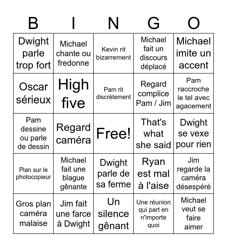 This bingo card has a free space and 24 words: Michael fait une blague gênante, Jim fait une farce à Dwight, Pam rit discrètement, Gros plan caméra malaise, Michael imite un accent, Dwight parle trop fort, Oscar sérieux, Michael chante ou fredonne, That's what she said, Dwight parle de sa ferme, Regard complice Pam / Jim, Pam dessine ou parle de dessin, Ryan est mal à l'aise, Jim regarde la caméra désespéré, High five, Une réunion qui part en n'importe quoi, Dwight se vexe pour rien, Kevin rit bizarrement, Pam raccroche le tel avec agacement, Regard caméra, Michael veut se faire aimer, Plan sur le photocopieur, Michael fait un discours déplacé and Un silence gênant.