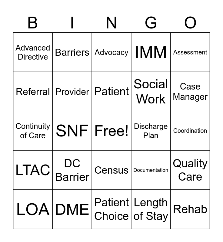 This bingo card has a free space and 24 words: DC Barrier, DME, Patient, LOA, Assessment, Advanced Directive, Referral, Barriers, Discharge Plan, Census, Social Work, Continuity of Care, Documentation, Quality Care, Provider, Length of Stay, Coordination, Advocacy, Case Manager, SNF, Rehab, LTAC, IMM and Patient Choice.