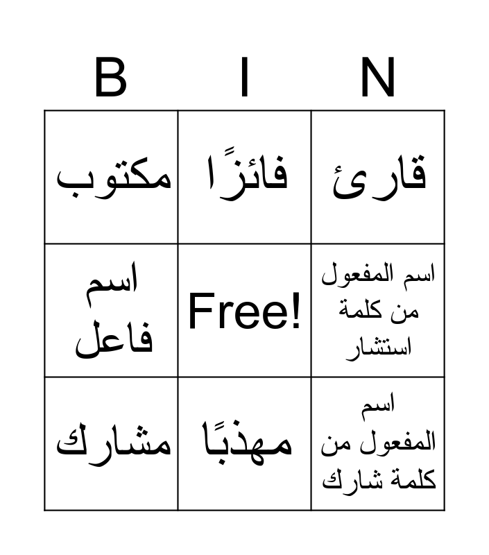 This bingo card has a free space and 21 words: مسرعًا, مستشار, فائزًا, محمول, والله, مشارك, مكتوب, قارئ, الحال, مهذبًا, عالم, اسم فاعل, اسم المفعول, اسم الفاعل من كلمة قرأ, اسم المفعول من كلمة استشار, اسم المفعول من كلمة كتب, حال لجملة خرج الطالب, حال لجملة هذا الفريق, اسم المفعول من كلمة شارك, اداة القسم في الجملة والله لادرس and اسم المفعول من كلمة حمل.
