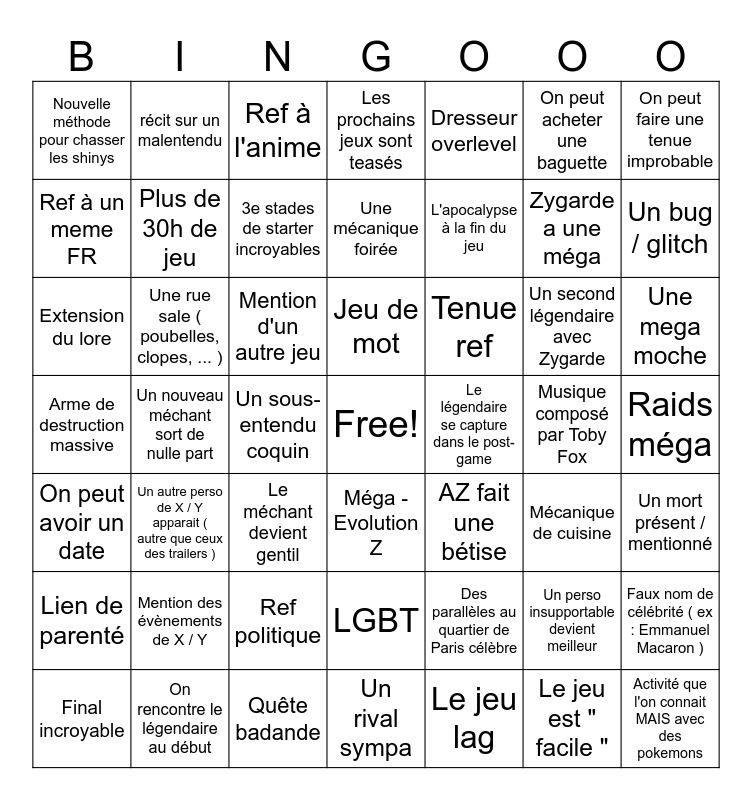 This bingo card has a free space and 48 words: Des parallèles au quartier de Paris célèbre, Zygarde a une méga, Un rival sympa, Un nouveau méchant sort de nulle part, Mention d'un autre jeu, Raids méga, récit sur un malentendu, On rencontre le légendaire au début, On peut acheter une baguette, Méga - Evolution Z, On peut faire une tenue improbable, Les prochains jeux sont teasés, Un second légendaire avec Zygarde, Tenue ref, Lien de parenté, Musique composé par Toby Fox, Ref à un meme FR, Un bug / glitch, Un perso insupportable devient meilleur, Dresseur overlevel, L'apocalypse à la fin du jeu, Un sous-entendu coquin, Nouvelle méthode pour chasser les shinys, Plus de 30h de jeu, Faux nom de célébrité ( ex : Emmanuel Macaron ), 3e stades de starter incroyables, Une mega moche, Final incroyable, Jeu de mot, Une rue sale ( poubelles, clopes, ... ), Le jeu est " facile ", Le légendaire se capture dans le post-game, Un mort présent / mentionné, Mention des évènements de X / Y, Arme de destruction massive, AZ fait une bétise, Mécanique de cuisine, Extension du lore, Le méchant devient gentil, Ref politique, On peut avoir un date, Activité que l'on connait MAIS avec des pokemons, Ref à l'anime, Quête badande, Une mécanique foirée, LGBT, Un autre perso de X / Y apparait ( autre que ceux des trailers ) and Le jeu lag.