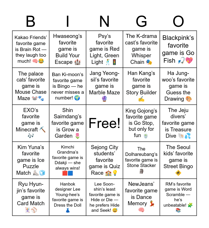 This bingo card has a free space and 33 words: King Sejong’s favorite game is Word Builder — of course! ✍️, Admiral Yi Sun-sin’s favorite game is Blue Marble 🌊, Shin Saimdang’s favorite game is Grow a Garden 🌷, BTS’s favorite game is Tetris — they stack beats and blocks 🎶🧱, Kim Yuna’s favorite game is Ice Puzzle Match ⛸️🧊, Ban Ki-moon’s favorite game is Bingo — he never misses a number! 🌍, Blackpink’s favorite game is Go Fish 🎣💖, Ryu Hyun-jin’s favorite game is Card Match 🃏⚾, Hwaseong’s favorite game is Build Your Escape 🏰, IU’s favorite game is 99 Nights in the Forest 🌲🎵, Jang Yeong-sil’s favorite game is Marble Maze 🔮, Psy’s favorite game is Red Light, Green Light 🕺🚦, Son Heung-min’s favorite game is Hide and Seek ⚽🙈, Park Ji-sung’s favorite game is Catch the Flag 🏳️🌈, King Gojong’s favorite game is Go Stop, but only for fun 🍵, Ha Jung-woo’s favorite game is Guess the Drawing 🎨, Hanbok designer Lee Young-hee’s favorite game is Dress the Doll 👗, EXO’s favorite game is Minecraft ⛏️🎶, Kimchi Grandma’s favorite game is Ddakji — she always wins! 🟥🟦, The Dolhareubang’s favorite game is Stone Stacker 🗿, Sejong City students’ favorite game is Quiz Race 🏫💡, The Gyeongbokgung guards’ favorite game is Freeze Tag 🧊🏯, Kakao Friends’ favorite game is Brain Rot — they laugh too much! 🧠😂, The Jeju divers’ favorite game is Treasure Dive 🐚💦, Lee Soon-shin’s least favorite game is Hide or Die — he prefers Hide and Seek! 😅, RM’s favorite game is Word Scramble — he’s unbeatable! 🧩📚, The K-drama cast’s favorite game is Whisper Chain 🎭, Han Kang’s favorite game is Story Builder ✍️, The palace cats’ favorite game is Mouse Chase Maze 🐭🐾, The Seoul kids’ favorite game is Street Bingo 🚸, Park Bo-gum’s favorite game is Smile Challenge 😁, NewJeans’ favorite game is Dance Memory 💃🧠 and Chungha’s favorite game is Rhythm Run 🕹️🎵.