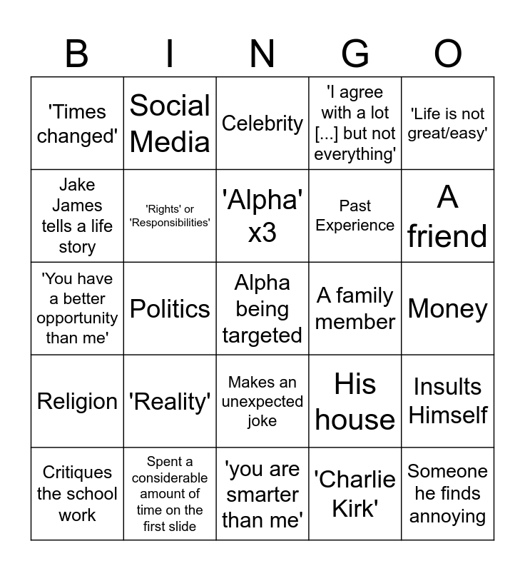 This bingo card has a free space and 24 words: 'Reality', Spent a considerable amount of time on the first slide, 'Alpha' x3, Critiques the school work, 'Life is not great/easy', 'Times changed', Jake James tells a life story, Social Media, A family member, Makes an unexpected joke, Past Experience, 'You have a better opportunity than me', His house, Insults Himself, 'Rights' or 'Responsibilities', 'Charlie Kirk', Money, Celebrity, A friend, Politics, Someone he finds annoying, Religion, 'I agree with a lot [...] but not everything' and 'you are smarter than me'.