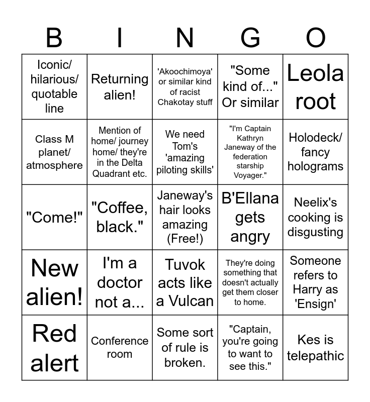 This bingo card has a free space and 24 words: I'm a doctor not a..., Conference room, We need Tom's 'amazing piloting skills', Red alert, Leola root, Iconic/ hilarious/ quotable line, Class M planet/ atmosphere, Returning alien!, B'Ellana gets angry, Tuvok acts like a Vulcan, "I'm Captain Kathryn Janeway of the federation starship Voyager.", "Come!", They're doing something that doesn't actually get them closer to home., Someone refers to Harry as 'Ensign', Mention of home/ journey home/ they're in the Delta Quadrant etc., "Captain, you're going to want to see this.", Neelix's cooking is disgusting, 'Akoochimoya' or similar kind of racist Chakotay stuff, Holodeck/ fancy holograms, "Coffee, black.", Kes is telepathic, New alien!, "Some kind of..." Or similar and Some sort of rule is broken..