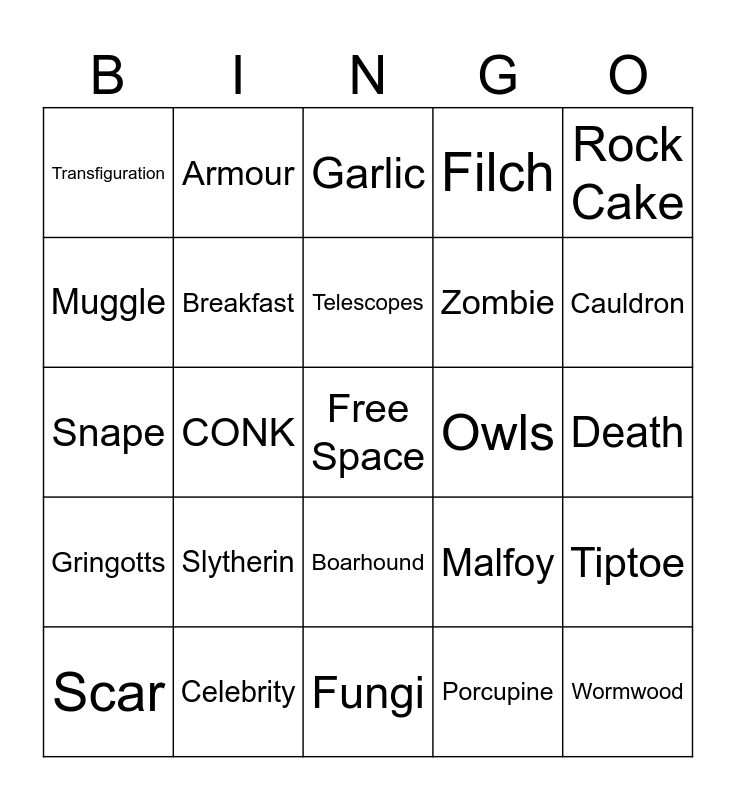 This bingo card has a free space and 29 words: Scar, Ghosts, CONK, Herbology, Transfiguration, Garlic, Breakfast, Slytherin, Owls, Celebrity, Death, Wormwood, Fungi, Porcupine, Cauldron, Galoshes, Boarhound, Gringotts, Rock Cake, Snape, Malfoy, Bezoar, Zombie, Muggle, Filch, Armour, Tiptoe, Telescopes and Oddball.