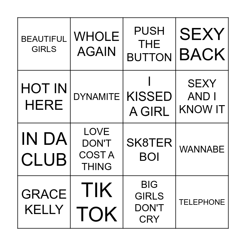This bingo card has 36 words: WHO LETS THE DOGS OUT?, LETS GET IT STARTED, DON'T STOP MOVIN', I KISSED A GIRL, CHA CHA SLIDE, TELEPHONE, SEXY AND I KNOW IT, DROP IT LIKE IT'S HOT, HOT IN HERE, SINCE U BEEN GONE, WANNABE, SEXY BACK, BYE BYE BYE, TIK TOK, LOVE DON'T COST A THING, BEAUTIFUL GIRLS, TEENAGE DIRTBAG, LIFESTYLES OF THE RICH AND FAMOUS, GRACE KELLY, PUSH THE BUTTON, BIG GIRLS DON'T CRY, I'M LIKE A BIRD, BLURRED LINES, DOMINO, PARTY IN THE USA, WHOLE AGAIN, SK8TER BOI, SO SICK, IN DA CLUB, DYNAMITE, SMOOTH CRIMINAL, BEHIND BLUE EYES, SUDDENLY I SEE, ALL THE SMALL THINGS, BETTER TOGETHER and YEAH!.