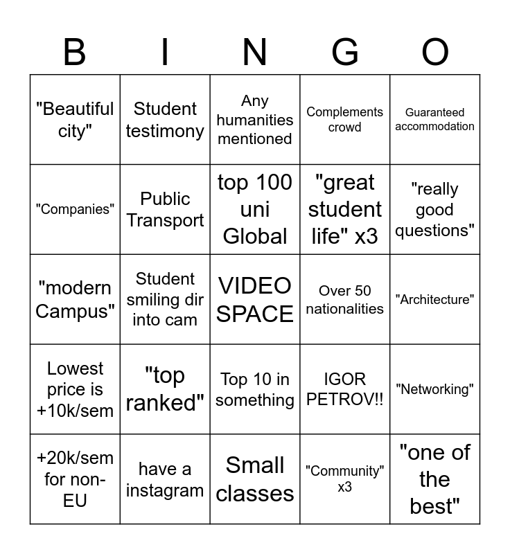 This bingo card has a free space and 24 words: "top ranked", have a instagram, top 100 uni Global, +20k/sem for non-EU, Guaranteed accommodation, "Beautiful city", "Companies", Student testimony, Over 50 nationalities, Top 10 in something, "great student life" x3, "modern Campus", IGOR PETROV!!, "Networking", Public Transport, "Community" x3, "Architecture", Any humanities mentioned, "really good questions", Student smiling dir into cam, "one of the best", Lowest price is +10k/sem, Complements crowd and Small classes.