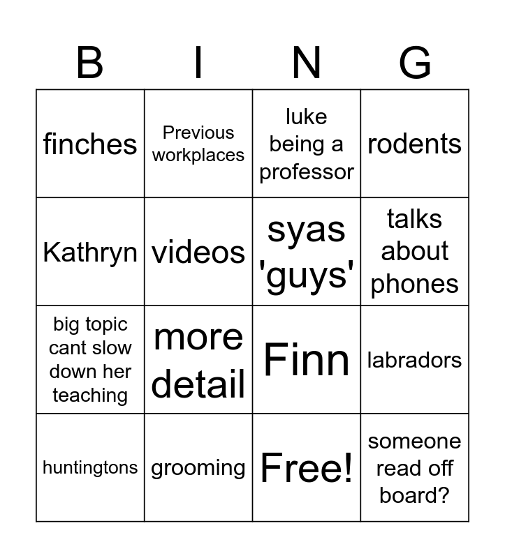 This bingo card has 17 words: Free!, huntingtons, luke being a professor, finches, more detail, rodents, labradors, syas 'guys', talks about phones, videos, grooming, Finn, Kathryn, Previous workplaces, big topic cant slow down her teaching, any work done? and someone read off board?.