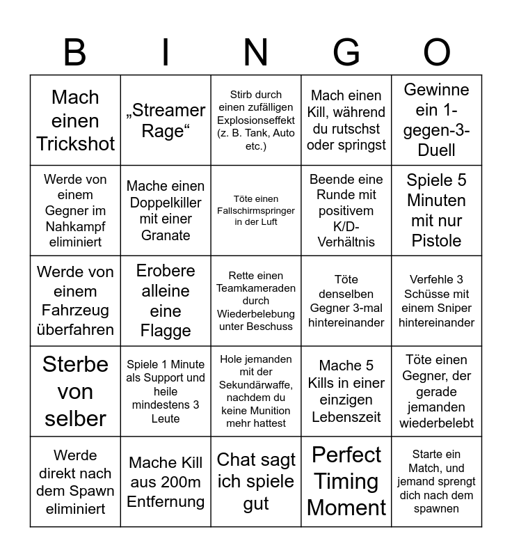 This bingo card has 25 words: Sterbe von selber, Mache Kill aus 200m Entfernung, Rette einen Teamkameraden durch Wiederbelebung unter Beschuss, Perfect Timing Moment, Gewinne ein 1-gegen-3-Duell, Mach einen Trickshot, „Streamer Rage“, Stirb durch einen zufälligen Explosionseffekt (z. B. Tank, Auto etc.), Töte denselben Gegner 3-mal hintereinander, Töte einen Gegner, der gerade jemanden wiederbelebt, Werde von einem Gegner im Nahkampf eliminiert, Mache einen Doppelkiller mit einer Granate, Chat sagt ich spiele gut, Mache 5 Kills in einer einzigen Lebenszeit, Spiele 5 Minuten mit nur Pistole, Werde direkt nach dem Spawn eliminiert, Erobere alleine eine Flagge, Töte einen Fallschirmspringer in der Luft, Beende eine Runde mit positivem K/D-Verhältnis, Verfehle 3 Schüsse mit einem Sniper hintereinander, Werde von einem Fahrzeug überfahren, Spiele 1 Minute als Support und heile mindestens 3 Leute, Hole jemanden mit der Sekundärwaffe, nachdem du keine Munition mehr hattest, Mach einen Kill, während du rutschst oder springst and Starte ein Match, und jemand sprengt dich nach dem spawnen.