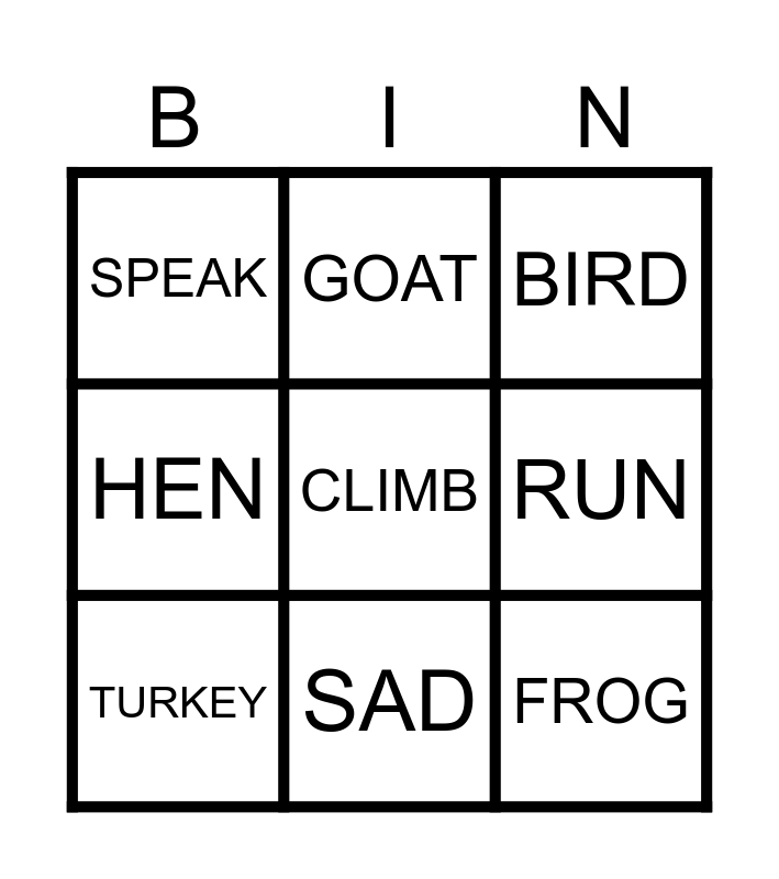 This bingo card has a free space and 8 words: RUN, BIRD, GOAT, TURKEY, SPEAK, FROG, HEN and SAD.
