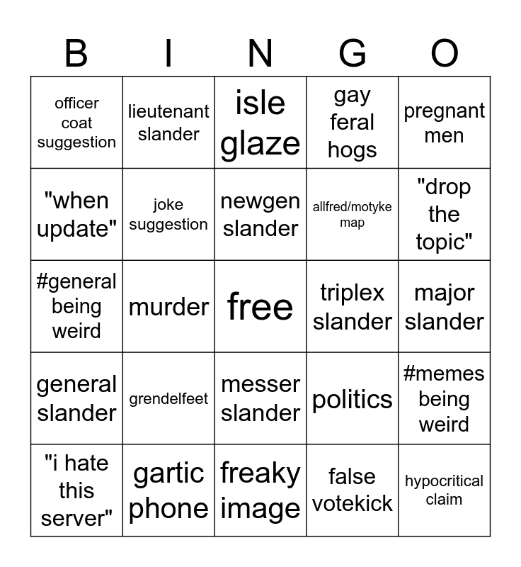 This bingo card has a free space and 24 words: grendelfeet, gartic phone, newgen slander, "i hate this server", pregnant men, officer coat suggestion, "when update", lieutenant slander, triplex slander, messer slander, allfred/motyke map, #general being weird, politics, #memes being weird, joke suggestion, false votekick, major slander, isle glaze, "drop the topic", murder, hypocritical claim, general slander, gay feral hogs and freaky image.