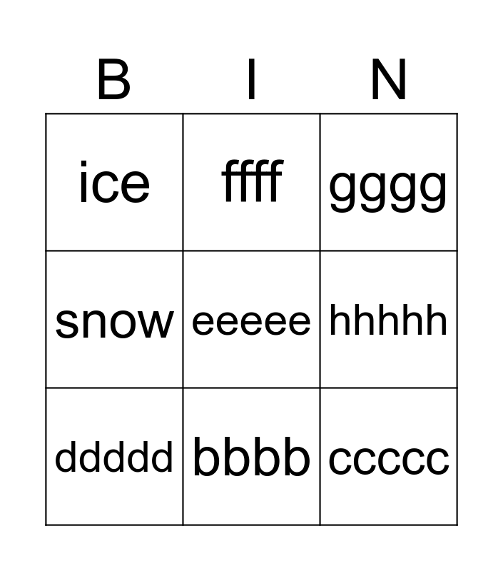 This bingo card has a free space and 11 words: aaa, bbbb, ccccc, ddddd, ffff, gggg, hhhhh, iiiii, snow, ice and ocean.