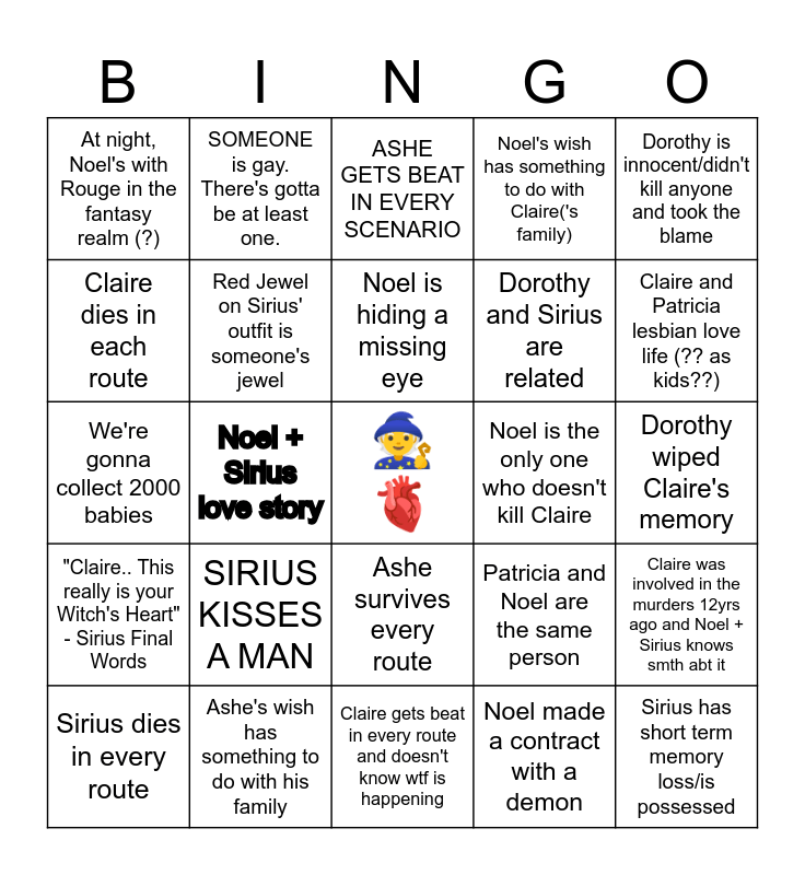 This bingo card has a free space and 24 words: SIRIUS KISSES A MAN, Ashe's wish has something to do with his family, Noel is hiding a missing eye, Sirius dies in every route, Dorothy is innocent/didn't kill anyone and took the blame, At night, Noel's with Rouge in the fantasy realm (?), Claire dies in each route, SOMEONE is gay. There's gotta be at least one., Noel is the only one who doesn't kill Claire, Ashe survives every route, Dorothy and Sirius are related, We're gonna collect 2000 babies, Patricia and Noel are the same person, Claire was involved in the murders 12yrs ago and Noel + Sirius knows smth abt it, Red Jewel on Sirius' outfit is someone's jewel, Noel made a contract with a demon, Dorothy wiped Claire's memory, ASHE GETS BEAT IN EVERY SCENARIO, Claire and Patricia lesbian love life (?? as kids??), Noel + Sirius love story, Sirius has short term memory loss/is possessed, "Claire.. This really is your Witch's Heart" - Sirius Final Words, Noel's wish has something to do with Claire('s family) and Claire gets beat in every route and doesn't know wtf is happening.