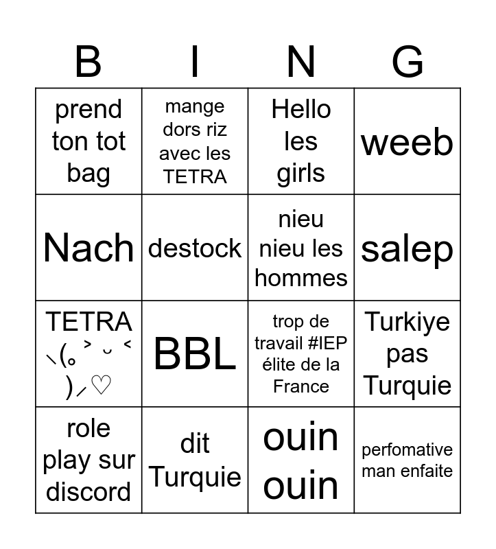 This bingo card has 16 words: dit Turquie, Turkiye pas Turquie, Hello les girls, prend ton tot bag, TETRA ⸜(。˃ ᵕ ˂ )⸝♡, mange dors riz avec les TETRA, trop de travail #IEP élite de la France, ouin ouin, Nach, destock, role play sur discord, weeb, BBL, salep, nieu nieu les hommes and perfomative man enfaite.