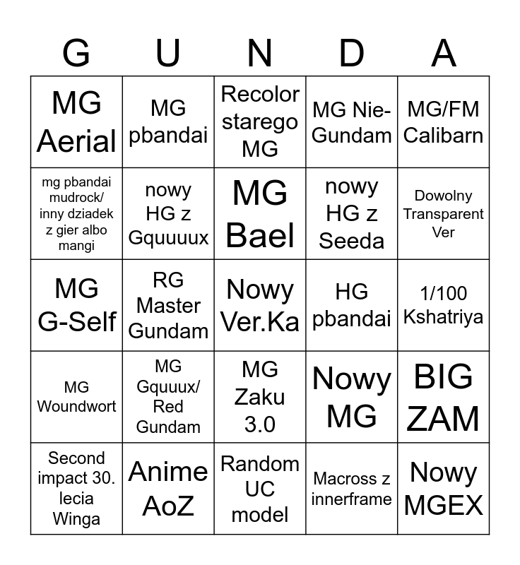 This bingo card has 25 words: MG Gquuux/ Red Gundam, Random UC model, MG Bael, Second impact 30. lecia Winga, MG/FM Calibarn, MG Aerial, mg pbandai mudrock/ inny dziadek z gier albo mangi, MG pbandai, HG pbandai, MG Zaku 3.0, nowy HG z Seeda, MG G-Self, Nowy MG, BIG ZAM, nowy HG z Gquuuux, Nowy MGEX, 1/100 Kshatriya, Recolor starego MG, Dowolny Transparent Ver, RG Master Gundam, Nowy Ver.Ka, Anime AoZ, MG Woundwort, MG Nie-Gundam and Macross z innerframe.