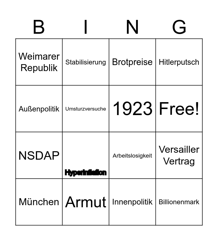 This bingo card has 18 words: Hyperinflation, Billionenmark, Brotpreise, Weimarer Republik, Arbeitslosigkeit, Hitlerputsch, München, Stabilisierung, Free!, NSDAP, Innenpolitik, Außenpolitik, Versailler Vertrag, Umsturzversuche, 1923, Mark, Armut and Aufstände.