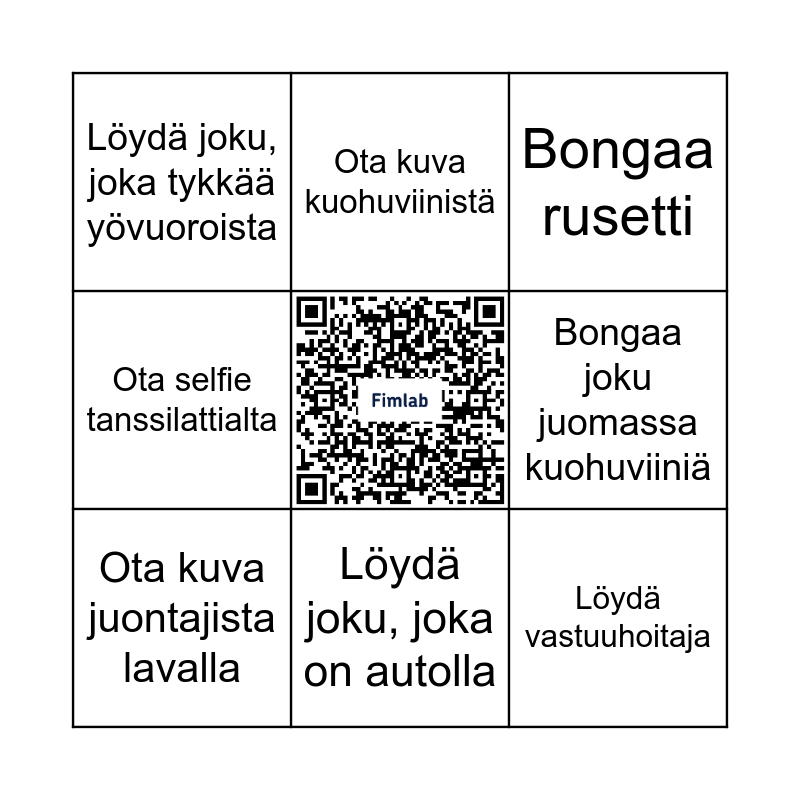 Kuvatehtävät jaetaan yhteiseen galleriaan keskiruudun QR-koodin kautta. Laita täytetty bingokortti arvontalaatikkoon viimeistään kello 22:00, jos haluat voittaa herkullisia palkintoja! Nimi: ___________________ | Jaa bingon kuvatehtävät keskellä olevan QR-koodin kautta yhteiseen kuvagalleriaan! Täytettyjen bingo-korttien kesken arvotaan palkintoja. | Kuvatehtävät jaetaan yhteiseen galleriaan keskiruudun QR-koodin kautta. Kirjoita bingokorttiin nimesi ja laita täytetty kortti arvontalaatikkoon kello 22:00 mennessä, jos haluat voittaa herkullisia palkintoja! | KATJA 60 V. | Pikkujoulubingo