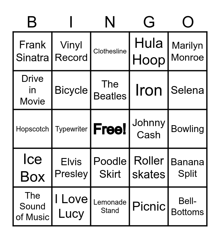 This bingo card has a free space and 24 words: Elvis Presley, I Love Lucy, The Beatles, The Sound of Music, Marilyn Monroe, Frank Sinatra, Drive in Movie, Vinyl Record, Johnny Cash, Poodle Skirt, Iron, Hopscotch, Roller skates, Banana Split, Bicycle, Picnic, Bowling, Clothesline, Selena, Typewriter, Bell-Bottoms, Ice Box, Hula Hoop and Lemonade Stand.