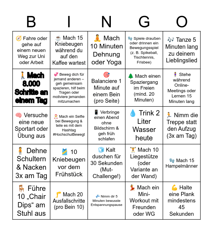 This bingo card has a free space and 24 words: 🎽 10 Kniebeugen vor dem Frühstück, 🦵 Mach 20 Ausfallschritte (pro Bein 10), 🎯 Balanciere 1 Minute auf einem Bein (pro Seite), 🪑 Führe 10 „Chair Dips“ am Stuhl aus, 🎶 Tanze 5 Minuten lang zu deinem Lieblingslied, 🧭 Fahre oder gehe auf einem neuen Weg zur Uni oder Arbeit, 🚶Mach 8.000 Schritte an einem Tag, ☕ Mach 15 Kniebeugen während du auf den Kaffee wartest, 💧 Trink 2 Liter Wasser heute, 🧊 Kalt duschen für 30 Sekunden (Mut-Challenge!), 🌲 Mach einen Spaziergang im Freien (mind. 20 Minuten), 🧠 Versuche eine neue Sportart oder Übung aus, 🏋️ Mach 10 Liegestütze (oder Variante an der Wand), 🧤 Mach 15 Hampelmänner, 💞 Beweg dich für jemand anderen – geh gemeinsam spazieren, hilf beim Tragen oder motiviere jemanden mitzumachen, 💃 Mach ein Mini-Workout mit Freunden oder WG, 🏃 Nimm die Treppe statt den Aufzug (3x am Tag), 🧘 Mach 10 Minuten Dehnung oder Yoga, 🧍♀️ Stehe während Online-Meetings oder Lernen 15 Minuten lang, 🎅 Mach ein Selfie bei Bewegung & teile es mit dem Hashtag #HochschulBewegt, 💪 Halte eine Plank mindestens 45 Sekunden, 🧍 Dehne Schultern & Nacken 3x am Tag, 🧤 Spiele draußen oder drinnen ein Bewegungsspiel (z. B. Spikeball, Tischtennis, Frisbee) and 💤 Nimm dir 5 Minuten bewusste Entspannungspause.
