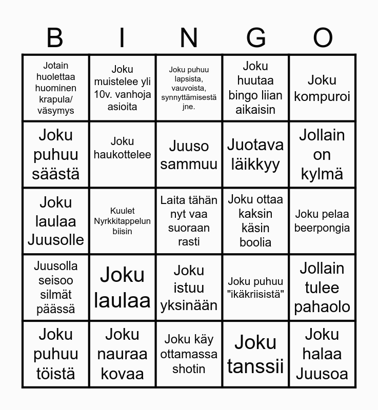 This bingo card has a free space and 24 words: Joku laulaa, Joku nauraa kovaa, Juuso sammuu, Joku puhuu töistä, Joku kompuroi, Jotain huolettaa huominen krapula/ väsymys, Joku puhuu säästä, Joku muistelee yli 10v. vanhoja asioita, Joku ottaa kaksin käsin boolia, Joku istuu yksinään, Juotava läikkyy, Joku laulaa Juusolle, Joku puhuu "ikäkriisistä", Jollain tulee pahaolo, Joku haukottelee, Joku tanssii, Joku pelaa beerpongia, Joku puhuu lapsista, vauvoista, synnyttämisestä jne., Jollain on kylmä, Kuulet Nyrkkitappelun biisin, Joku halaa Juusoa, Juusolla seisoo silmät päässä, Joku huutaa bingo liian aikaisin and Joku käy ottamassa shotin.