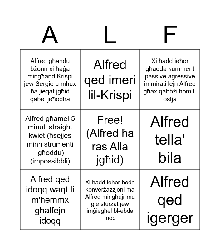This bingo card has a free space and 8 words: Alfred tella' bila, Xi ħadd ieħor għadda kumment passive agressive immirati lejn Alfred għax qabbżilhom l-ostja, Alfred qed imeri lil-Krispi, Alfred qed idoqq waqt li m'hemmx għalfejn idoqq, Alfred għandu bżonn xi ħaġa mingħand Krispi jew Sergio u mhux ħa jieqaf jgħid qabel jeħodha, Alfred qed igerger, Alfred għamel 5 minuti straight kwiet (ħsejjes minn strumenti jgħoddu)(impossibbli) and Xi ħadd ieħor beda konverżazzjoni ma Alfred mingħajr ma ġie sfurzat jew imġiegħel bl-ebda mod.