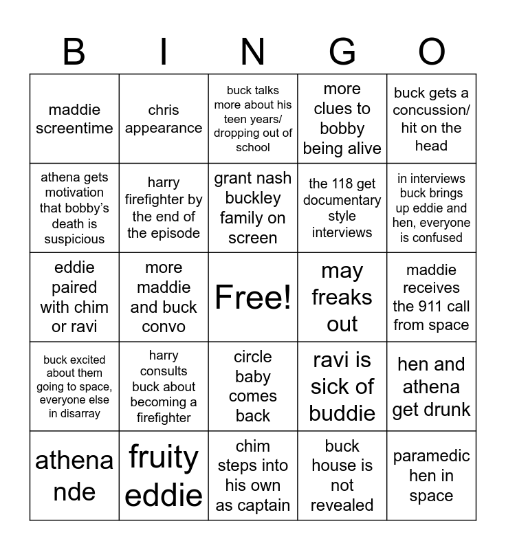 This bingo card has a free space and 24 words: harry consults buck about becoming a firefighter, fruity eddie, grant nash buckley family on screen, athena nde, buck gets a concussion/ hit on the head, maddie screentime, athena gets motivation that bobby’s death is suspicious, chris appearance, may freaks out, circle baby comes back, the 118 get documentary style interviews, eddie paired with chim or ravi, ravi is sick of buddie, hen and athena get drunk, harry firefighter by the end of the episode, buck house is not revealed, maddie receives the 911 call from space, buck talks more about his teen years/ dropping out of school, in interviews buck brings up eddie and hen, everyone is confused, more maddie and buck convo, paramedic hen in space, buck excited about them going to space, everyone else in disarray, more clues to bobby being alive and chim steps into his own as captain.