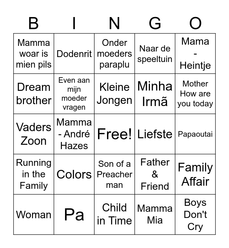 This bingo card has a free space and 52 words: Always on the run, Boys Don't Cry, Carlifornia Dreamin', Child in Time, Colors, Daughter, Dodenrit, Does your Mother Know, Dream brother, Europapa, Even aan mijn moeder vragen, Every Time I Think of You, Family Affair, Father & Friend, Father and Son, Isn't She Lovely, Kleine Jongen, Liefste, Mama - Genesis, Mama - Heintje, Mamma - André Hazes, Mamma Mia, Mamma woar is mien pils, Minha Irmã, M'n Opa, Momma, Mother Stands for Comfort, Mother and Child Reunion, Mother How are you today, My Baby Just Cares for Me, My Boy, Naar de speeltuin, New Born, Oma, Oma's Aan de Top, Onder moeders paraplu, Pa, Papa, Papa Don't Preach, Papa lied, Papa was a Rolling Stone, Papaoutai, Running in the Family, Shame and Scandal in the Family, Son of a Preacher man, Stacy's Mom, Sweet Child O'Mine, Vaders Zoon, Wat's Going on, We are Family, Woman and Your Mother Should Know.