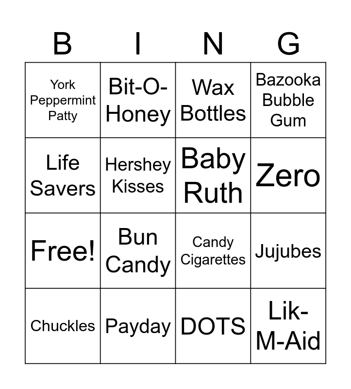 This bingo card has 20 words: Chuckles, Good and Plenty, Wax Bottles, Jujubes, Necco Wafers, Bun Candy, DOTS, Bazooka Bubble Gum, Free!, Bit-O-Honey, Candy Cigarettes, Zero, York Peppermint Patty, Payday, Baby Ruth, Lemonheads, Life Savers, Hershey Kisses, Milk Duds and Lik-M-Aid.