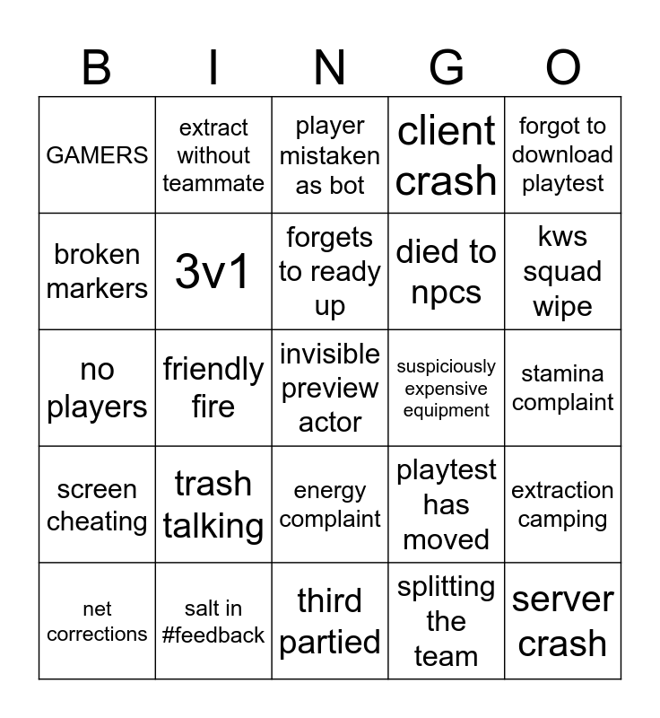 This bingo card has 27 words: playtest has moved, server crash, died to npcs, third partied, broken markers, player mistaken as bot, extract without teammate, screen cheating, suspiciously expensive equipment, extraction camping, no players, client crash, net corrections, salt in #feedback, kws squad wipe, bad driving, 3v1, forgets to ready up, trash talking, GAMERS, stamina complaint, splitting the team, friendly fire, invisible preview actor, energy complaint, forgot to download playtest and glaive one-shot.