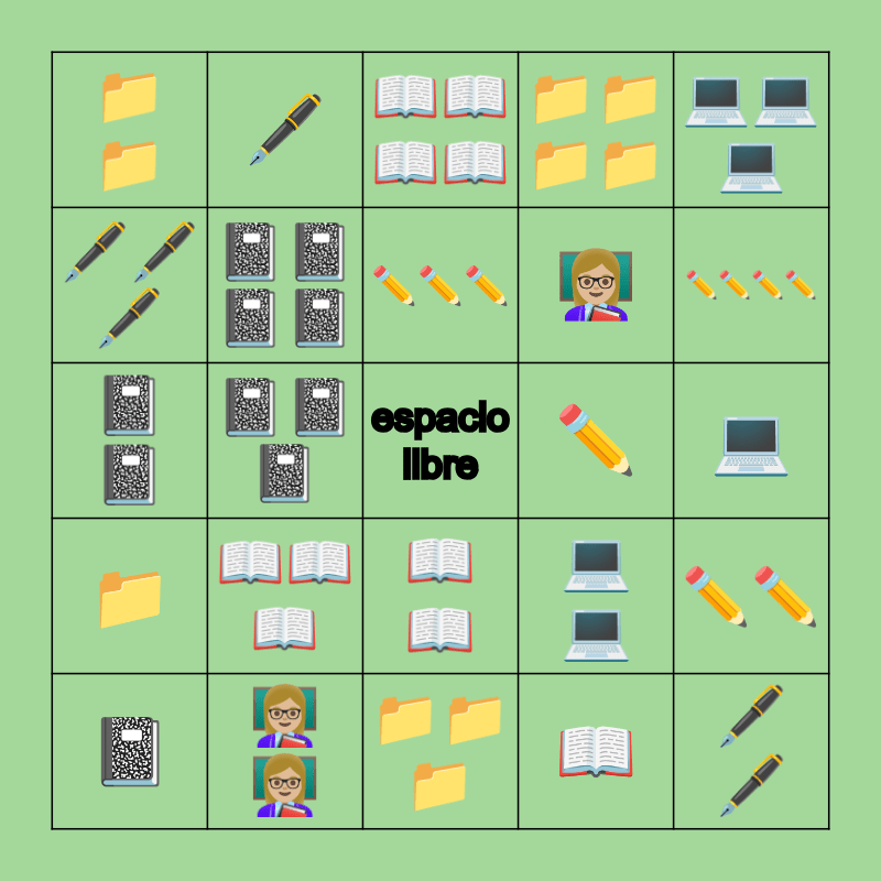 This bingo card has a free space and 28 words: ✏️✏️, 🖋️🖋️🖋️🖋️, 👩🏼🏫, 📖, 🖋️🖋️🖋️, 📖📖📖📖, 🖋️, 📁, ✏️, 📓, 📓📓, 📁📁📁📁, 👩🏼🏫👩🏼🏫, 📁📁📁, ✏️✏️✏️✏️, 👩🏼🏫👩🏼🏫👩🏼🏫, 📖📖📖, 📓📓📓📓, ✏️✏️✏️, 📖📖, 📁📁, 👩🏼🏫👩🏼🏫👩🏼🏫👩🏼🏫, 🖋️🖋️, 📓📓📓, 💻, 💻💻, 💻💻💻 and 💻💻💻💻.